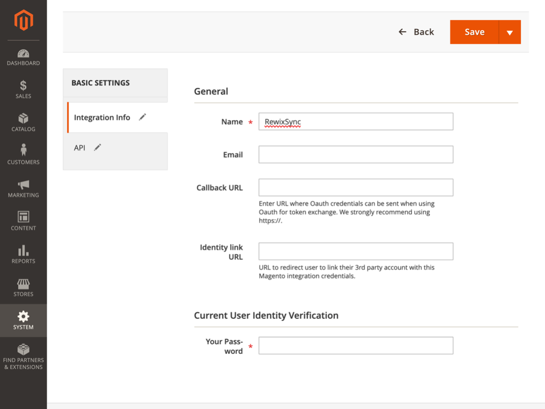 To activate the integration permissions via API it is necessary to click from the control panel of your Magento 2 store in the navigation menu System > Extension Integrations> Add new integration: