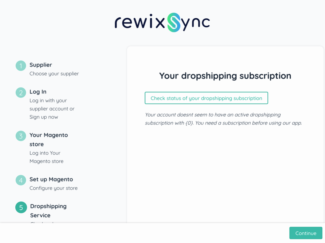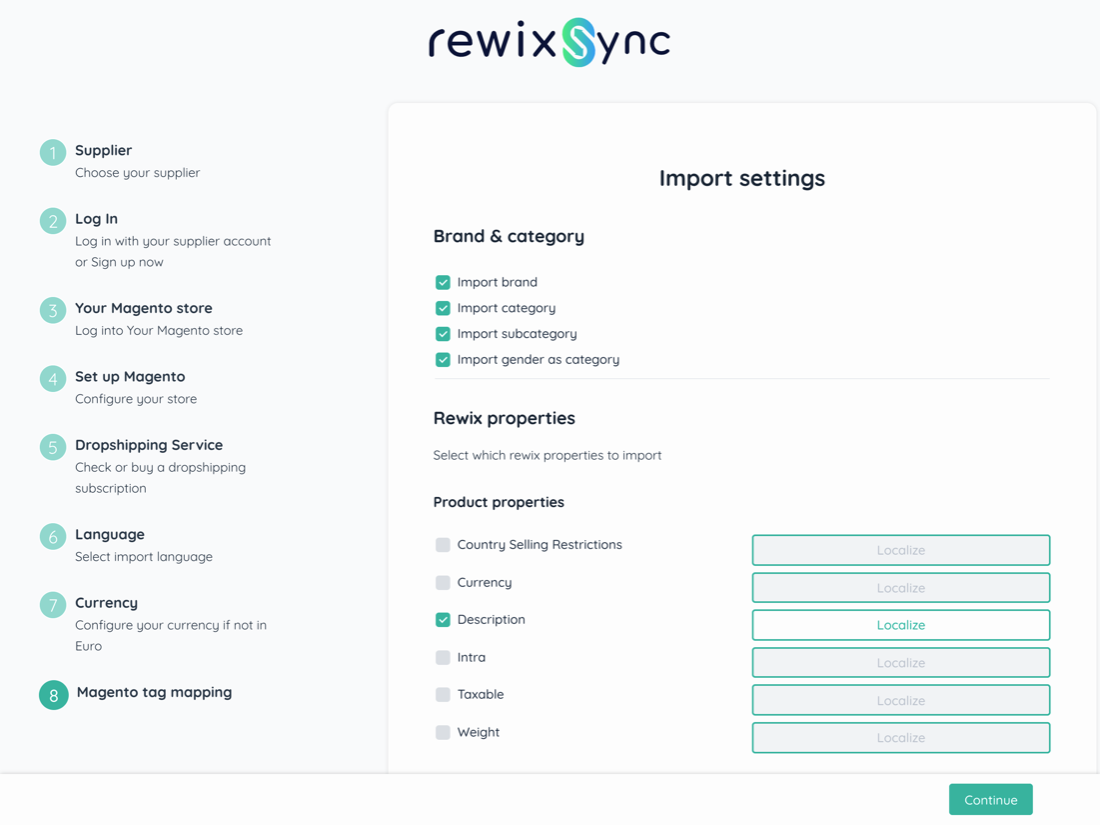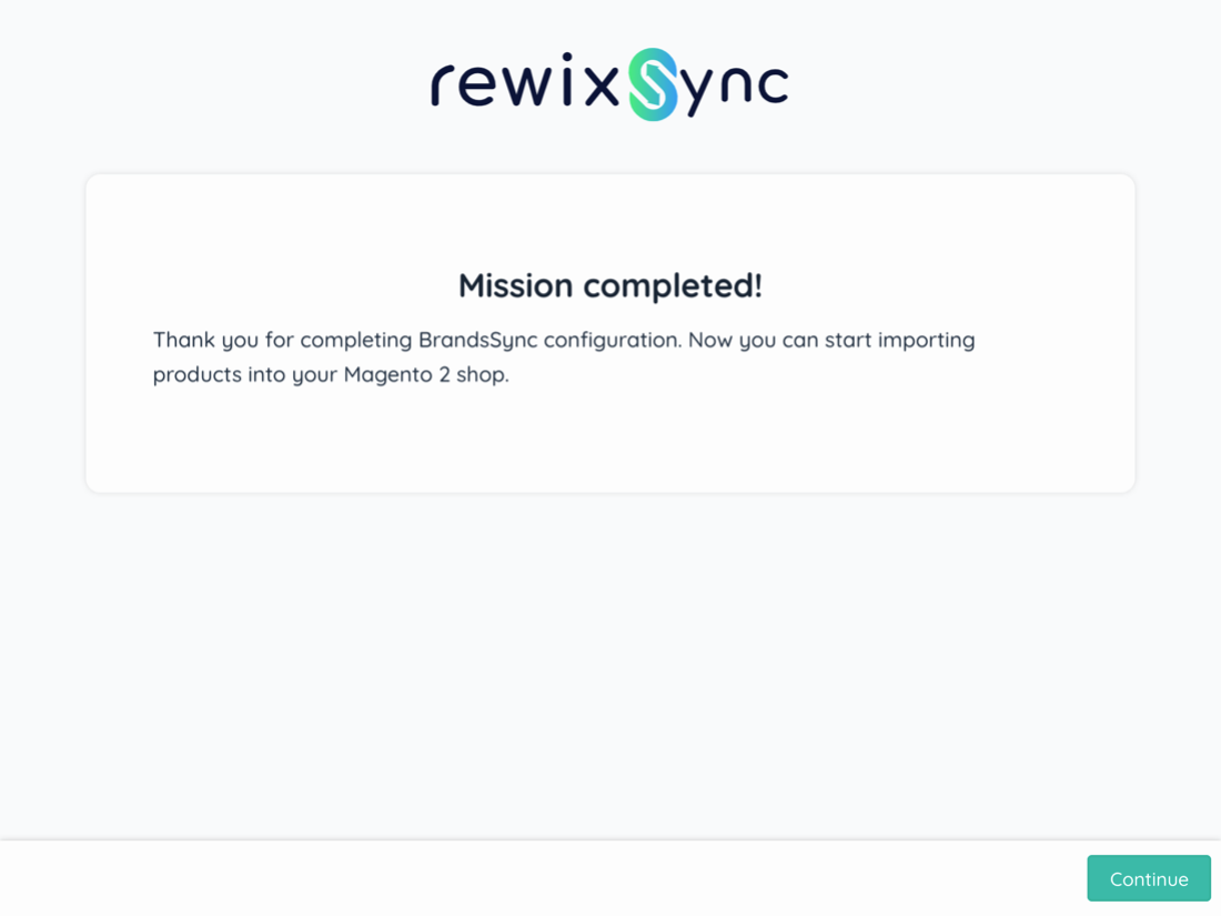 During the installation of the RewixSync app, a wizard will help you set up your first product import in your Magento 2 store.