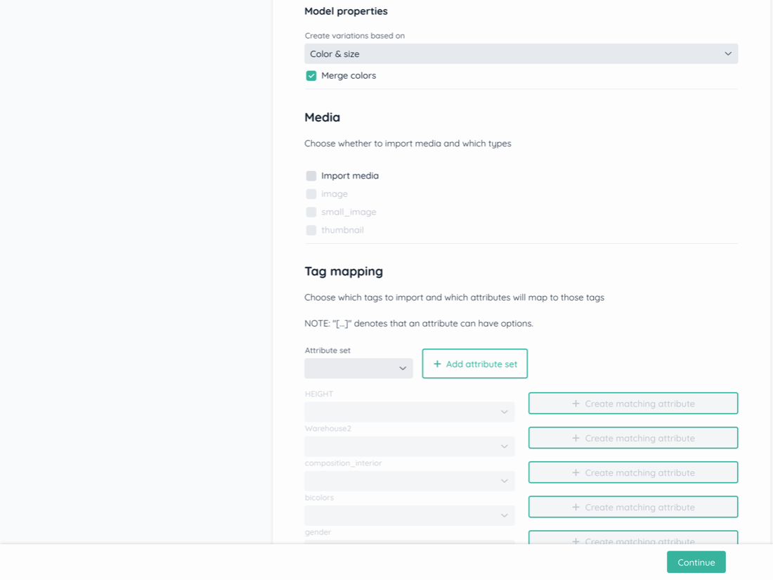 Your supplier's products may contain several additional attributes / tags that you can decide to import to your Magento site. In this section you can decide which other attributes to import and how to map them with the attributes that are already configured on your Magento site.