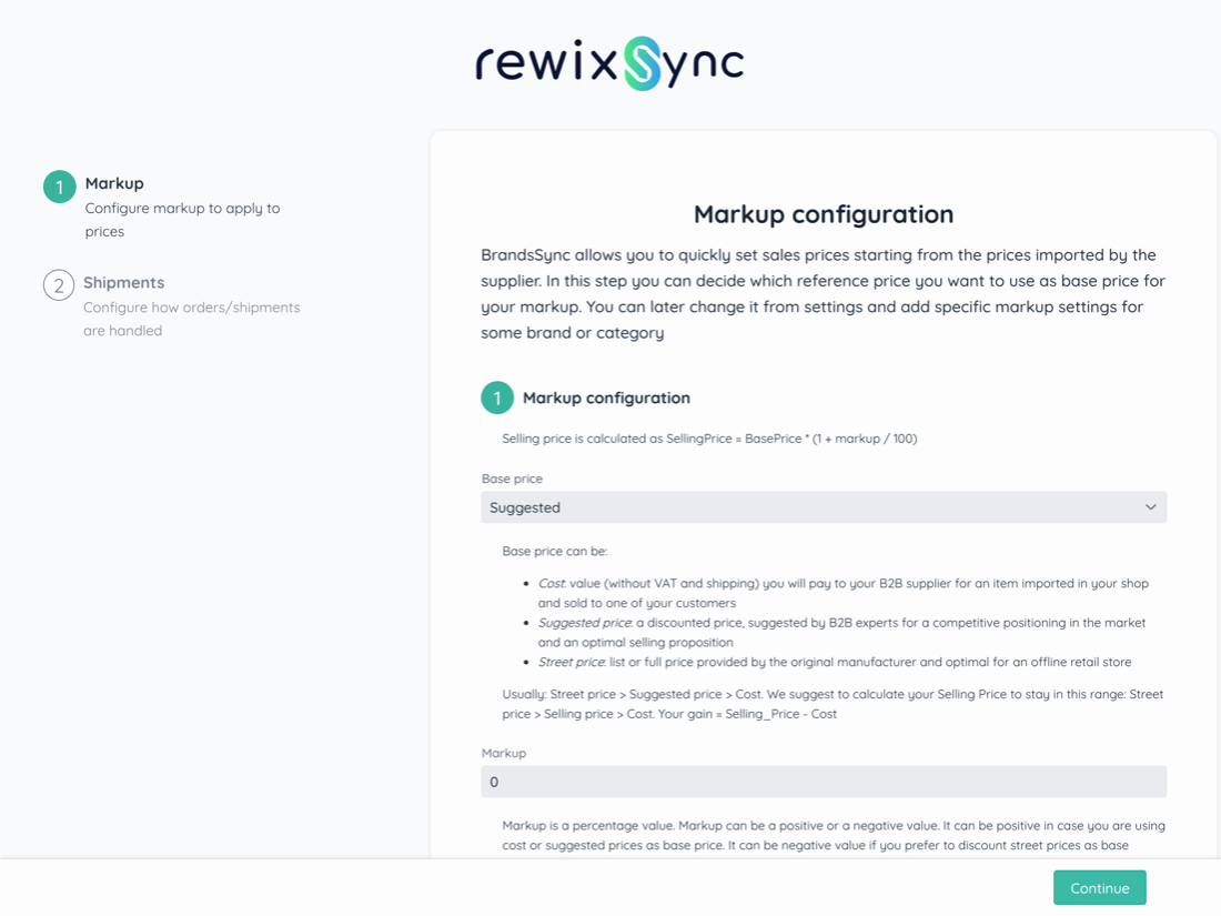 It will also be possible to apply percentages reserved only to some brands, to some categories, or to certain sub-categories of the catalog that you will import. These additional rules can be set later from the BrandsSync App dashboard by clicking on Pricing Rules.