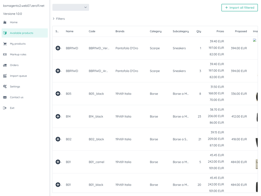 Through the Filters section it is possible to search for a specific product through the free search field. Or you can filter the product list by brand, category, subcategory, genre, season.