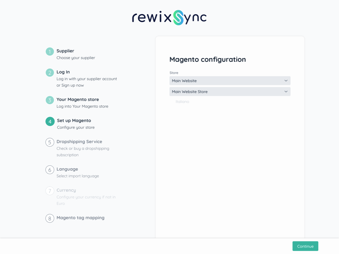 Warning: RewixSync does not support multi-language and multi-currency sites. During the configuration phase you will then have to choose which language to import (therefore in which language the products will be imported) and which currency will be applied in the sales prices.